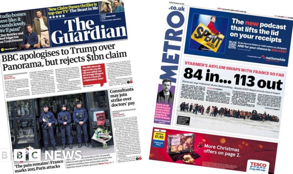 Issued one day before the deadline set by the US president, the BBC’s official apology to Donald Trump leads the way on the front page of the Guardian. Under the headline “BBC apologises to Trump over Panorama, but rejects $1bn claim” the paper quotes the BBC’s public statement that “sincerely regrets” how it edited a clip of his speech in a Panorama documentary, but strongly disagrees there is a basis for Trump’s defamation claim.