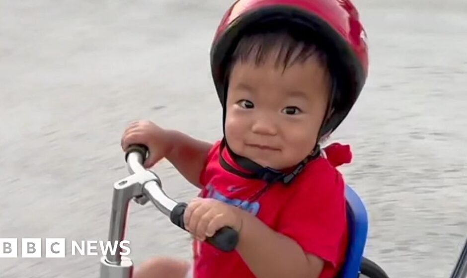 Chu family Oliver Chu rides a red tricycle. He is wearing a red helmet, red T-shirt and red and white shorts and is looking at the cameraChu family