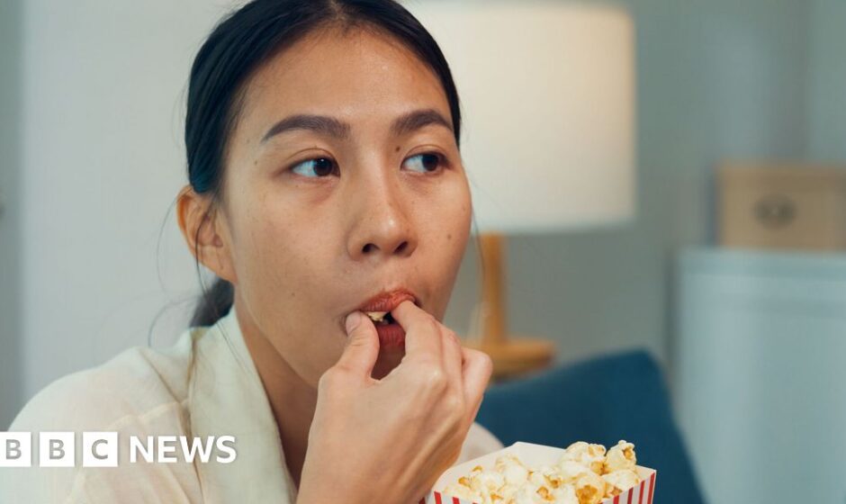 BBC and Getty portratit photo of Dr Xand and stock photo shows two women sitting on the sofa eating popcorn from a bowl with a desktop computer and plants in the background.BBC and Getty