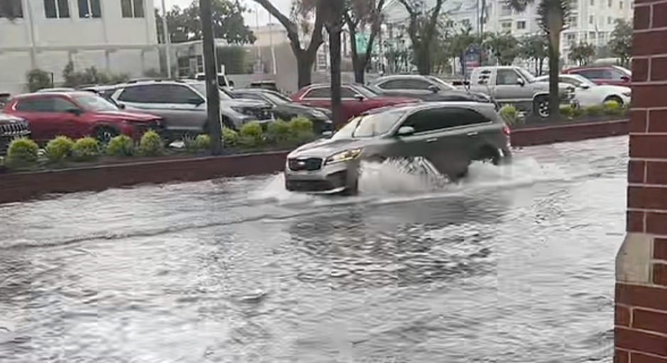A TikTok video shared from Charleston, South Carolina, shows vehicles trying to drive through floodwaters on Aug. 11, 2025.