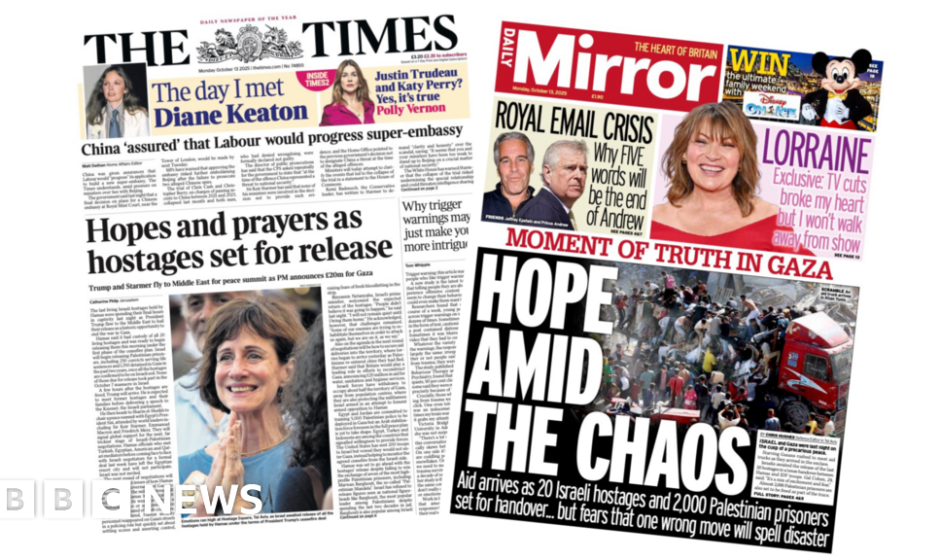 The imminent release of Israeli hostages by Hamas is the focus for most of Monday morning’s papers, with the Times dubbing it an “historic opportunity to end the war in Gaza”. According to the paper, Hamas says they have custody of all 20 living hostages, and will begin releasing them on Monday under the first phase of the ceasefire plan. US President Donald Trump is expected to land in Israel shortly after the first hostages have been freed.