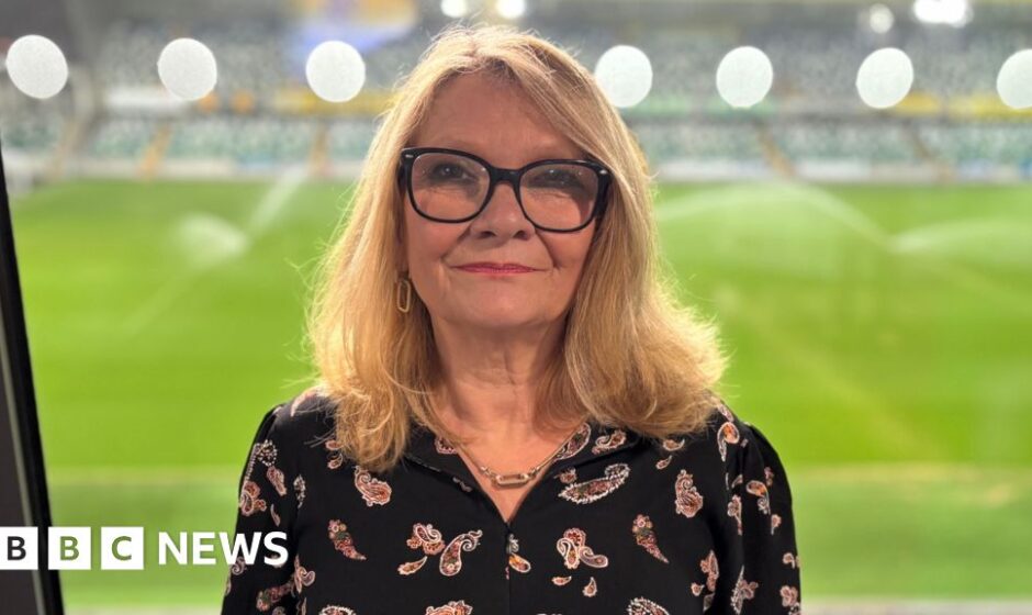 BBC Sarah Mason is standing in a glass room overlooking a green football pitch. She has long blonde hair, is wearing black framed glasses and a black paisley red patterened top. BBC