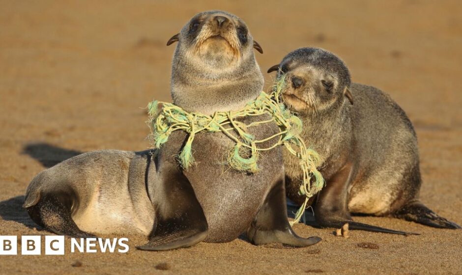 Getty Images Two seal pups rest on a sandy beach. One seal has a rope of yellow and green plastic caught around its neck. Getty Images