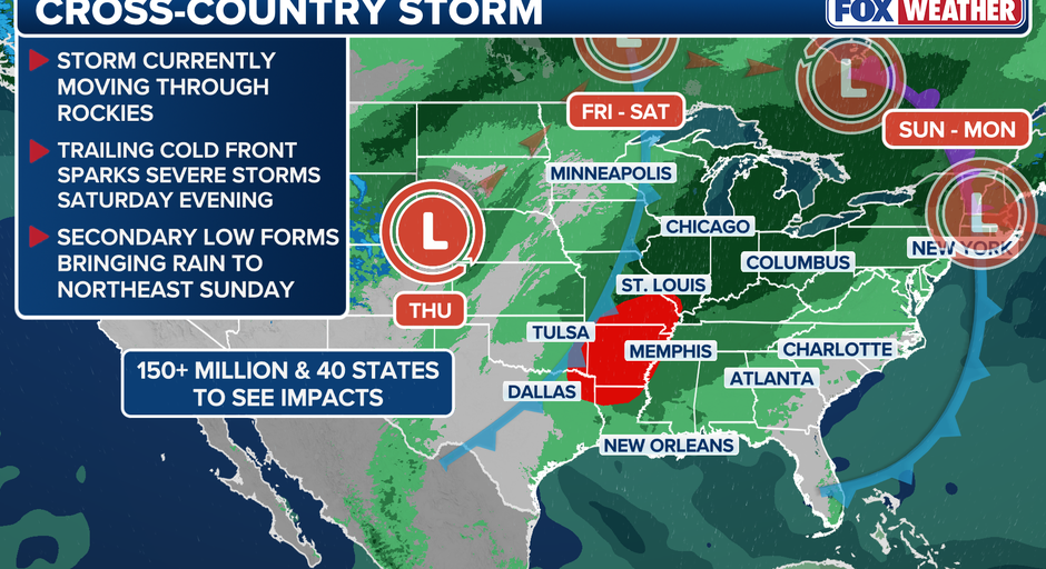 The FOX Forecast Center is monitoring a potent fall cross-country storm that will cover 40 states and bring severe weather to the central U.S. and days of heavy rain to the Northeast this weekend and into early next week.