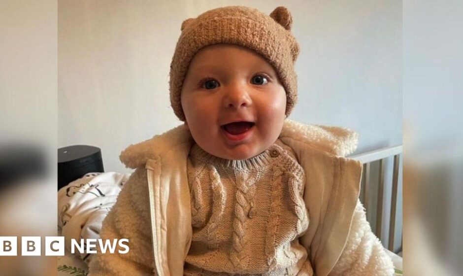Family handout A baby boy is smiling widely. He is wearing a fluffy coat and knitted hat. He looks happy. Family handout