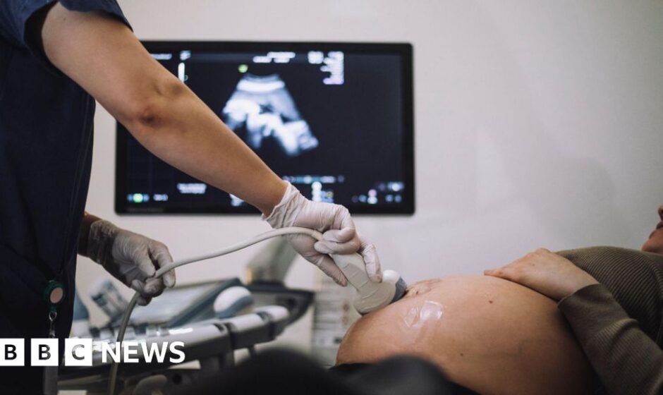 Getty Images Stock shot of a pregnant woman being given an ultrasound scan. You can see the lady's pregnant belly and a scanning tool being operated by a medical practitioner wearing gloves. Behind is an out-of-focus image of the baby appearing on screen.Getty Images